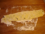 - Le lendemain, fariner la table, étaler la pâte en carré. Etaler les morceaux de chocolat (photo 1), rouler la pâte sur elle-même et applatir avec le plat de la main (photo 2). Rouler de nouveau la pâte dans l'autre sens (photo 3) puis former un gros boudin pour pouvoir couper 8 tranches (photo 4).